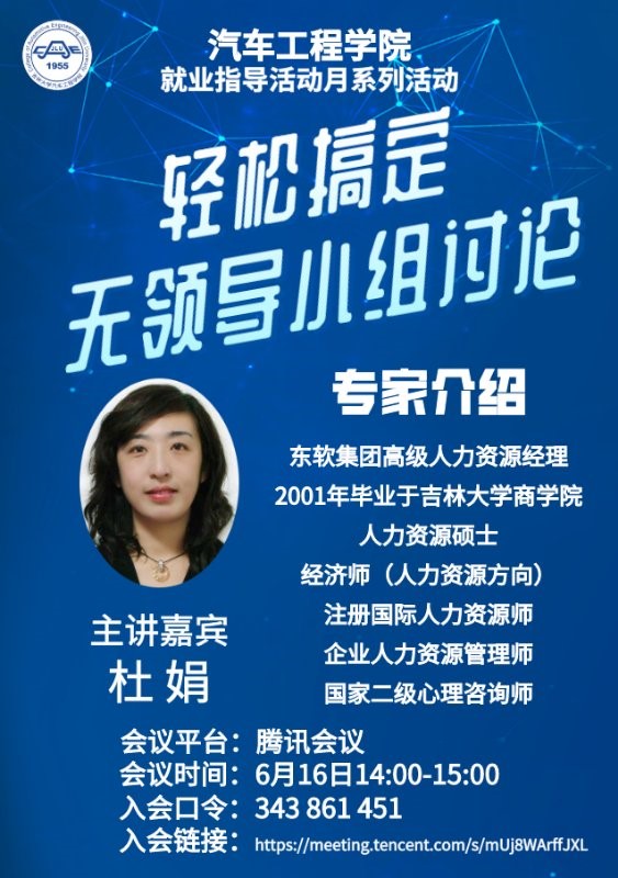 此次活动采用线上形式进行,杜鹃女士首先讲述了无领导小组讨论在当今就业面试的重要性以及无领导小组讨论的各种形式及适用范围。她指出,无领导小组会议是现在企业选拔具有领导能力人才的最主要方式,了解和掌握无领导小组会议对于面试至关重要。接着,杜娟女士又通过实例讲解了无领导小组会议的流程,说“无领导小组会议的题型是比较固定的,其流程也相对固定,可分为起始阶段、独立发言、自由讨论、总结陈词、最后离场五个过程。同学们需要紧紧把握无领导小组面试的流程。”随后,她给同学们讲解了参加无领导小组讨论的技巧,帮助同学们在把握时机,引导讨论方向,保证角色分工明确,找准自己的定位等多个方面提升自己的能力。